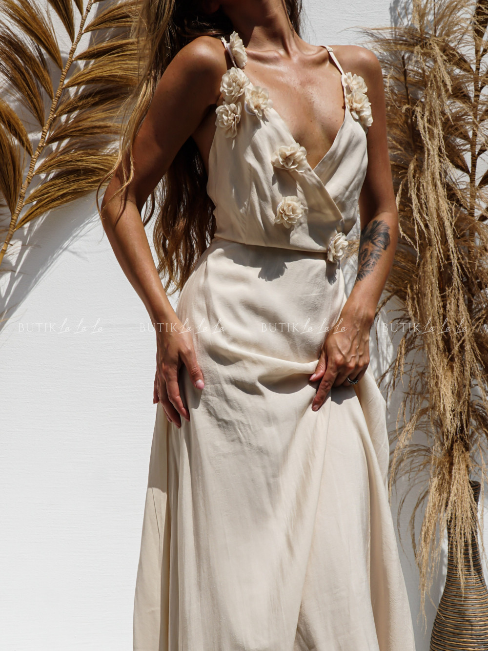 Sukienka kremowa z kwiatową aplikacją Frella
