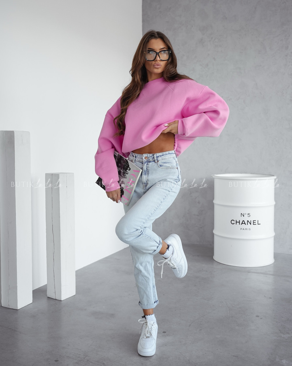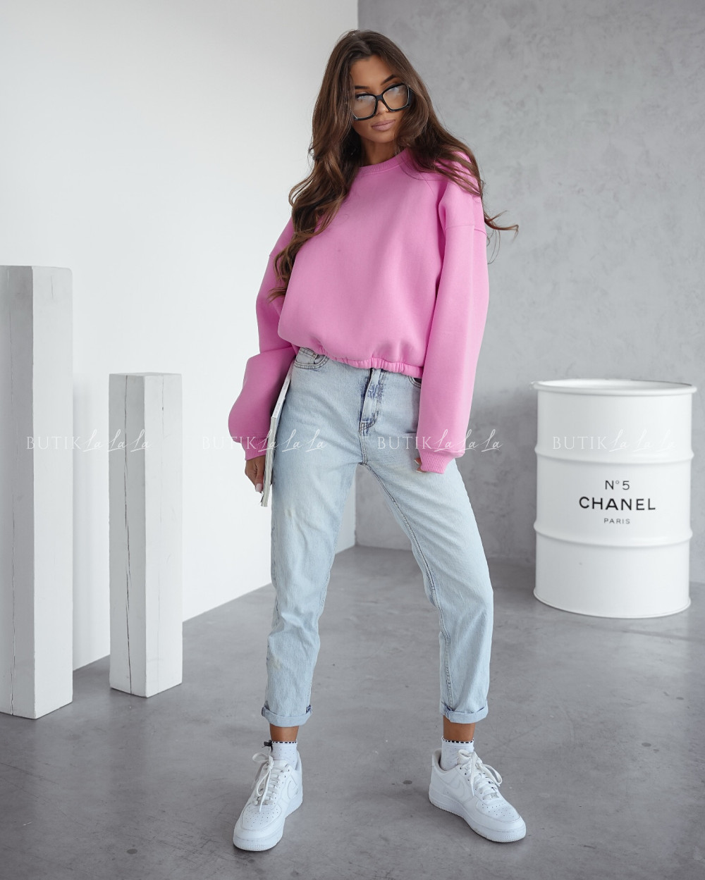 Modelka ma 170 cm wzrostu, prezentuje rozmiar UNI