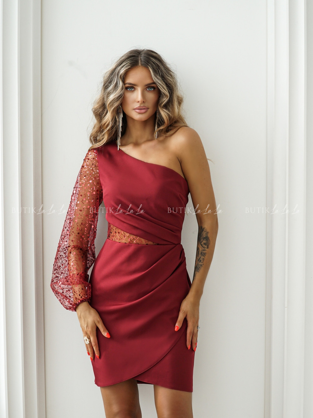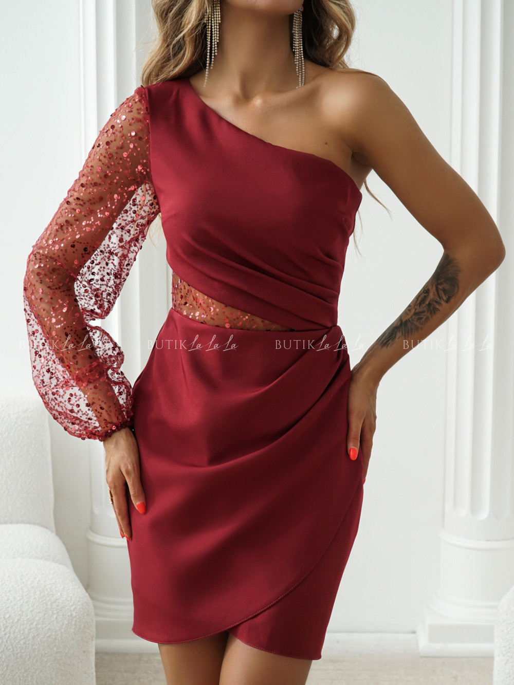 Sukienka mini bordowa na jedno ramie Florinka