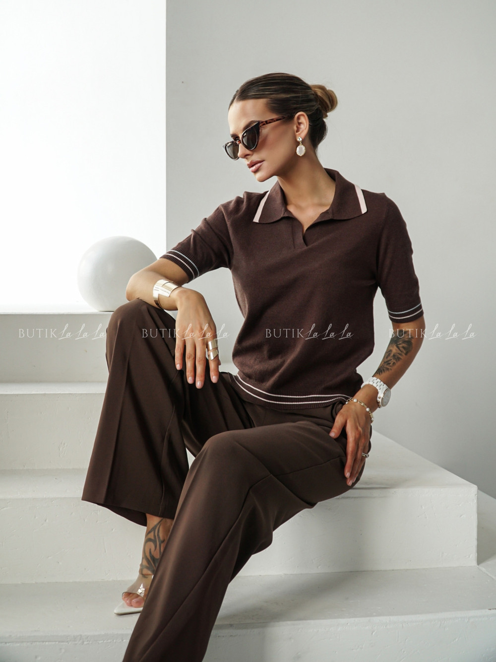 Bluzka dzianinowa typu polo brązowa Dinom