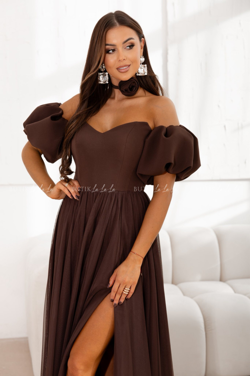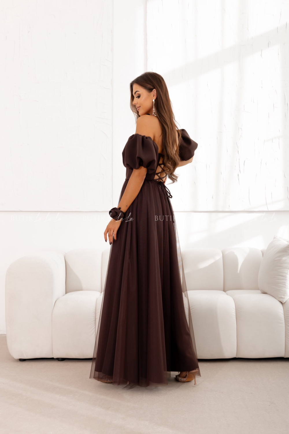 Sukienka maxi z rękawami tiulowa brązowa Bridget