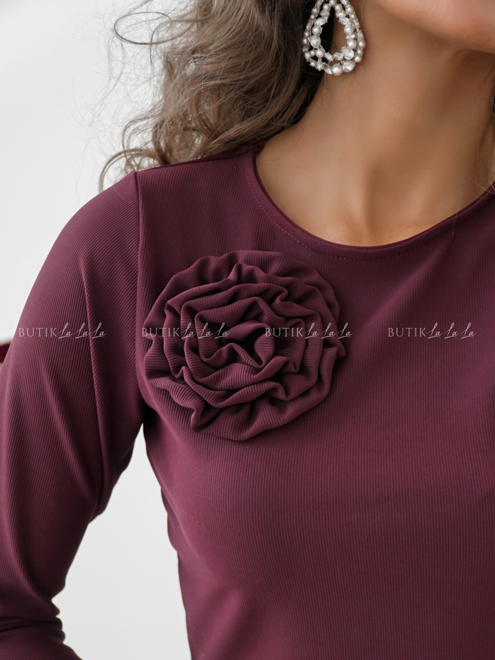 Komplet prążkowany z kwiatem śliwka Leonore