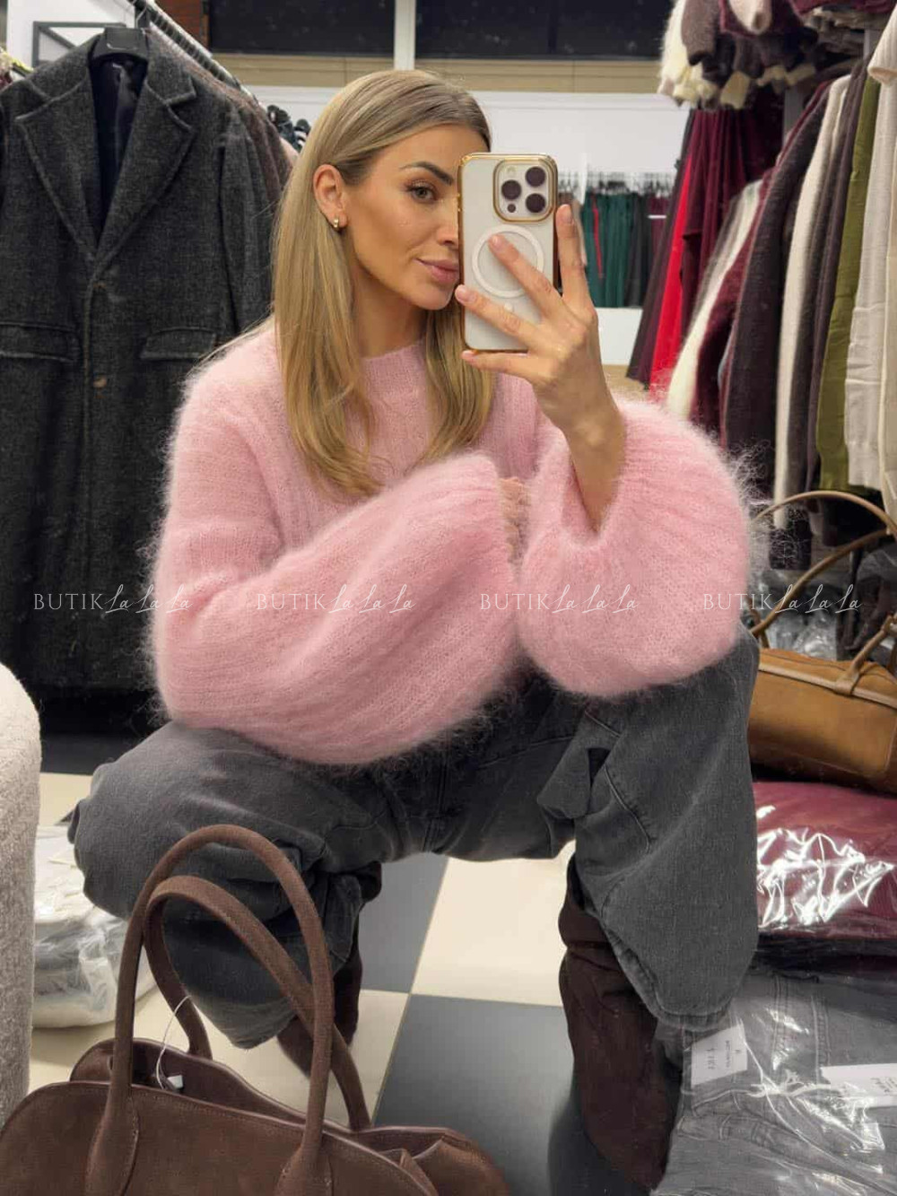 Sweter moherowy z rękawami typu baloon pudrowy Cosy