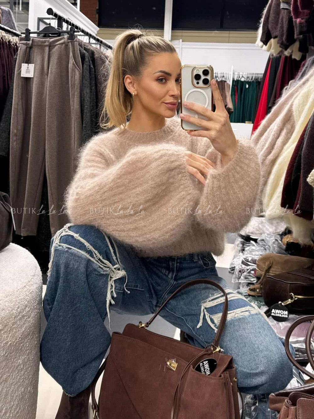 Sweter moherowy z rękawami typu baloon beżowy Cosy