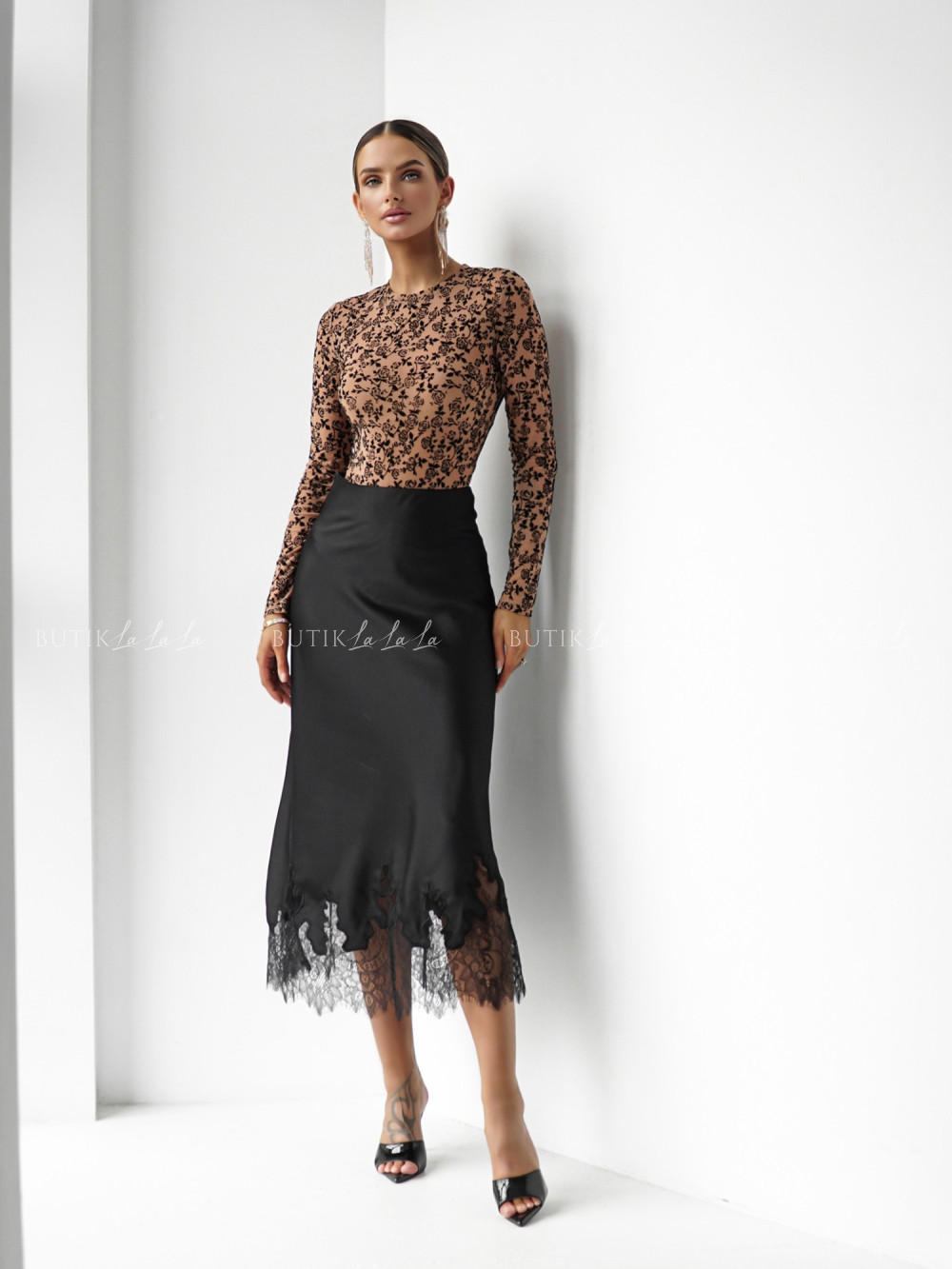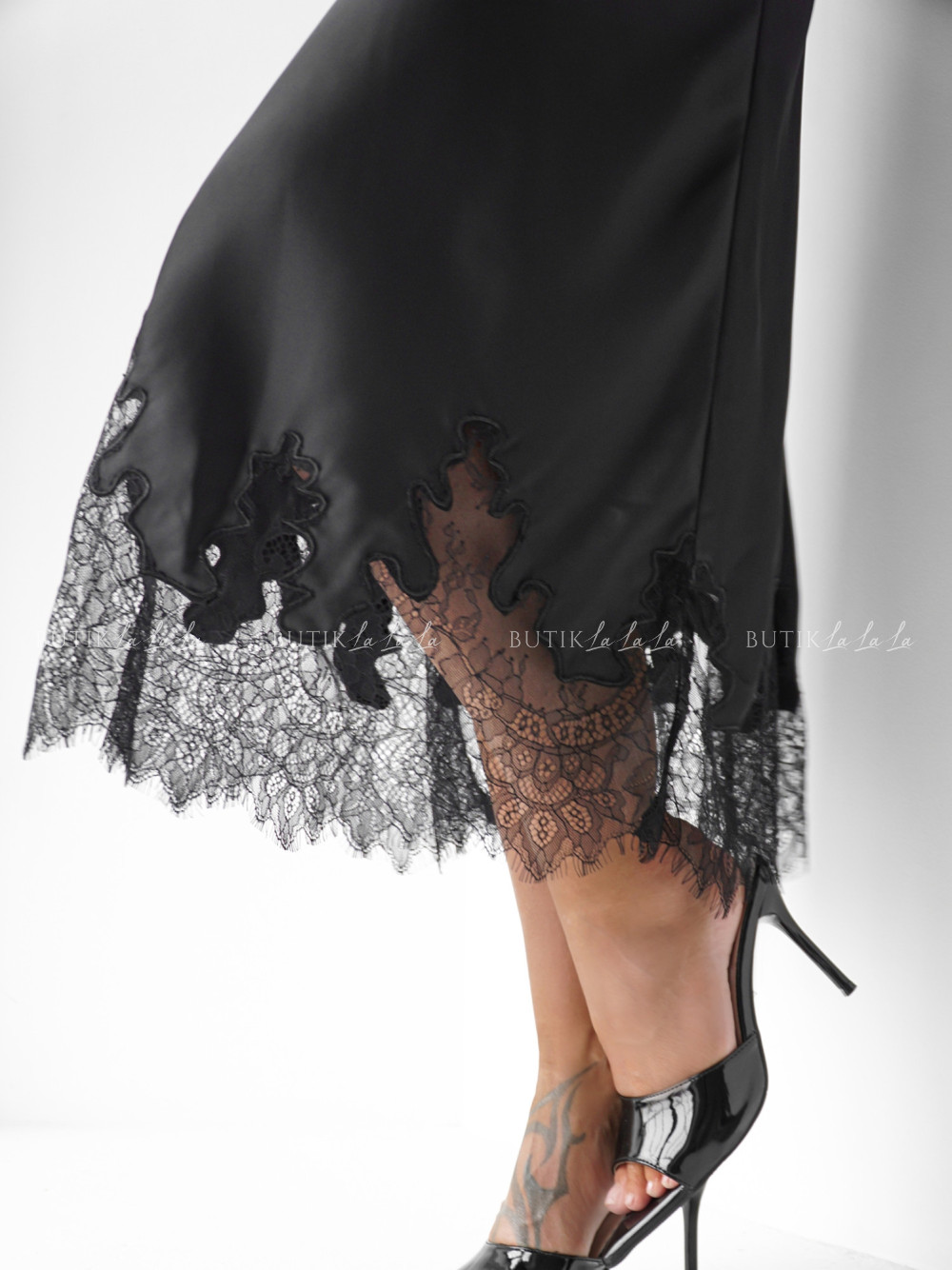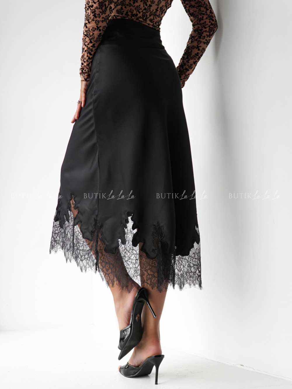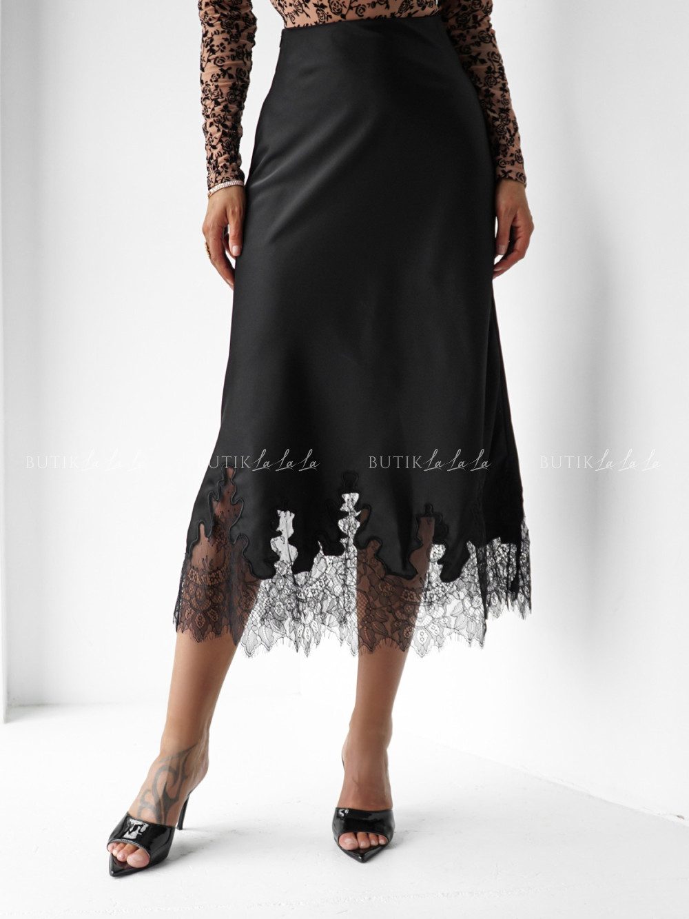 Spódnica satynowa z koronką czarna Lumie