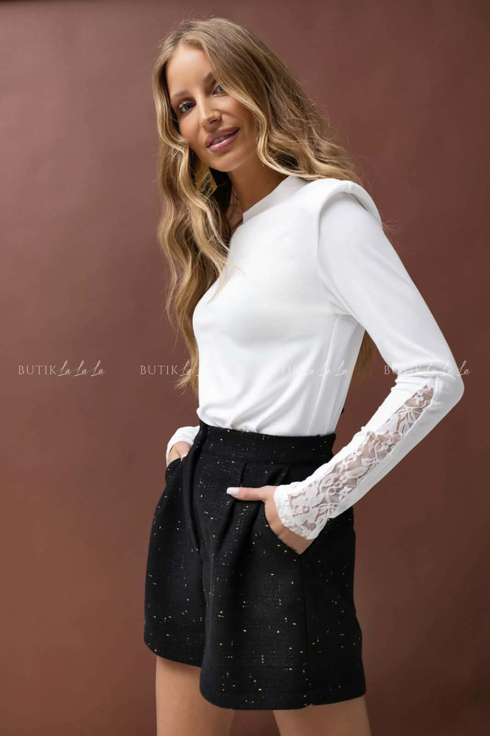 Model ten wyróżnia się unikalnym, kobiecym wzornictwem, którego kluczowym elementem jest ozdobna wstawka z delikatnej, transparentnej koronki. Koronka zdobi rękaw, nadając stylizacji lekkości i eleganckiego charakteru. Prosimy o zwrócenie uwagi, że ażurowa struktura koronki jest cechą dekoracyjną produktu i w tych miejscach materiał naturalnie prześwituje, co jest widoczne na zdjęciach.