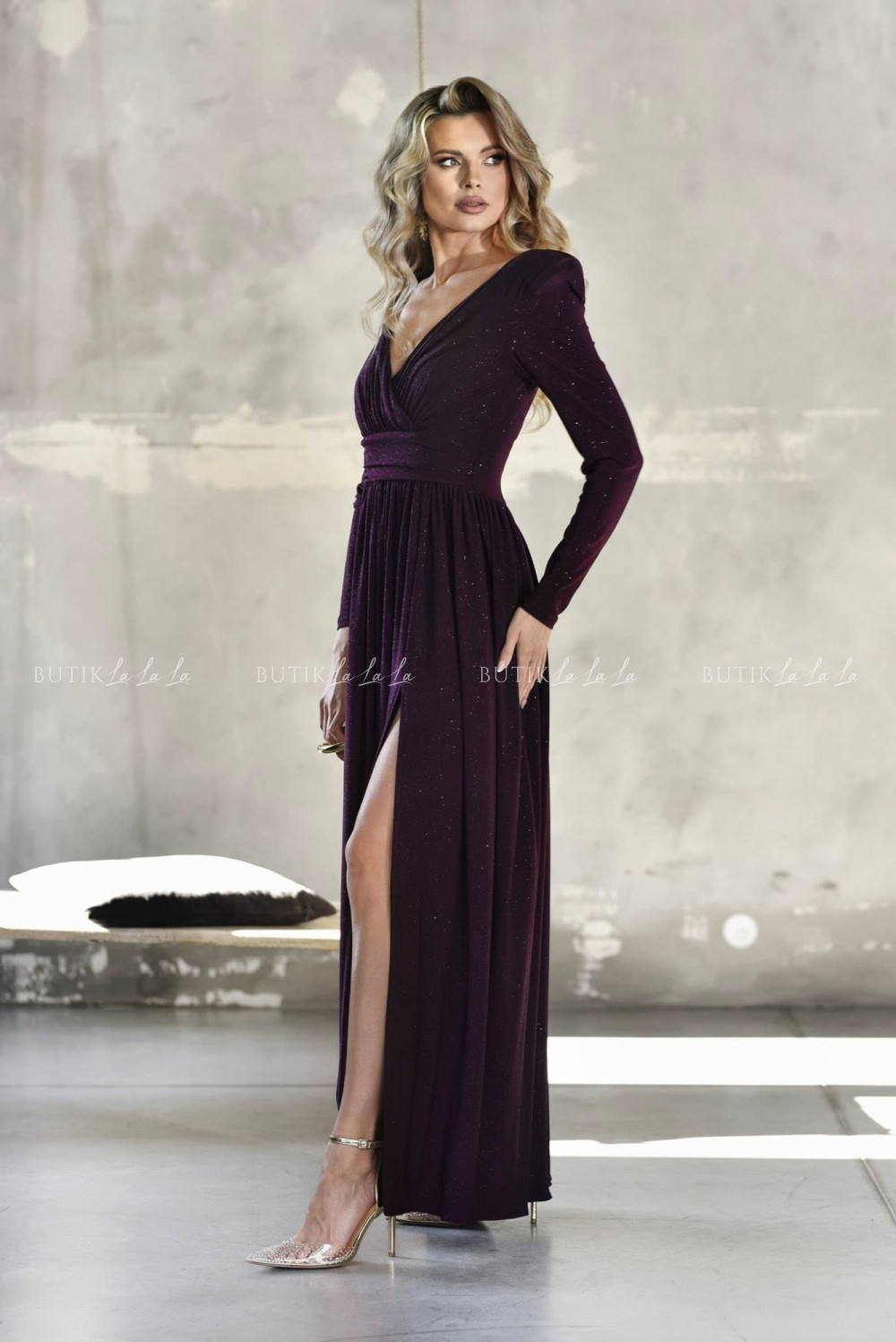 Sukienka maxi na długi rękaw brokatowa śliwkowa Melody