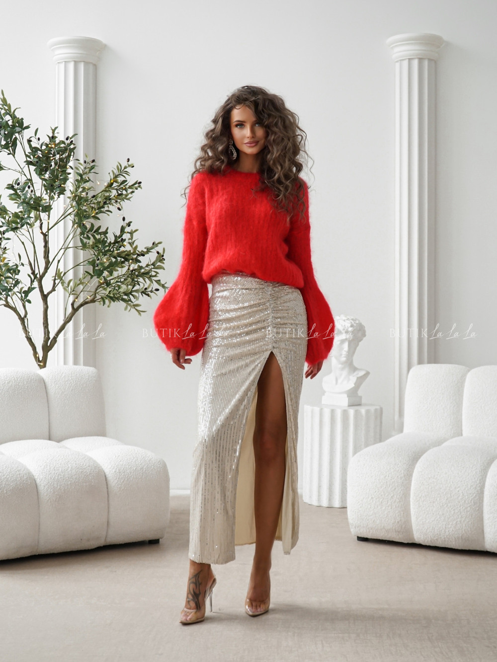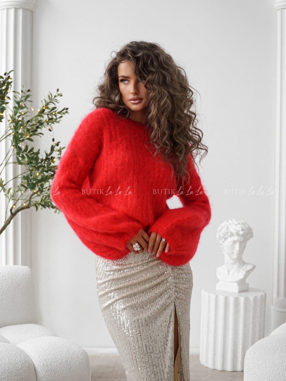 Sweter moherowy z rękawami typu baloon czerwony Cosy