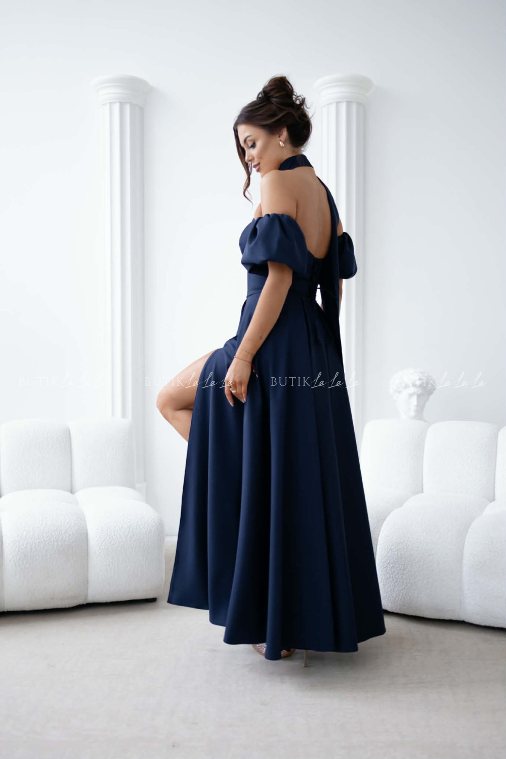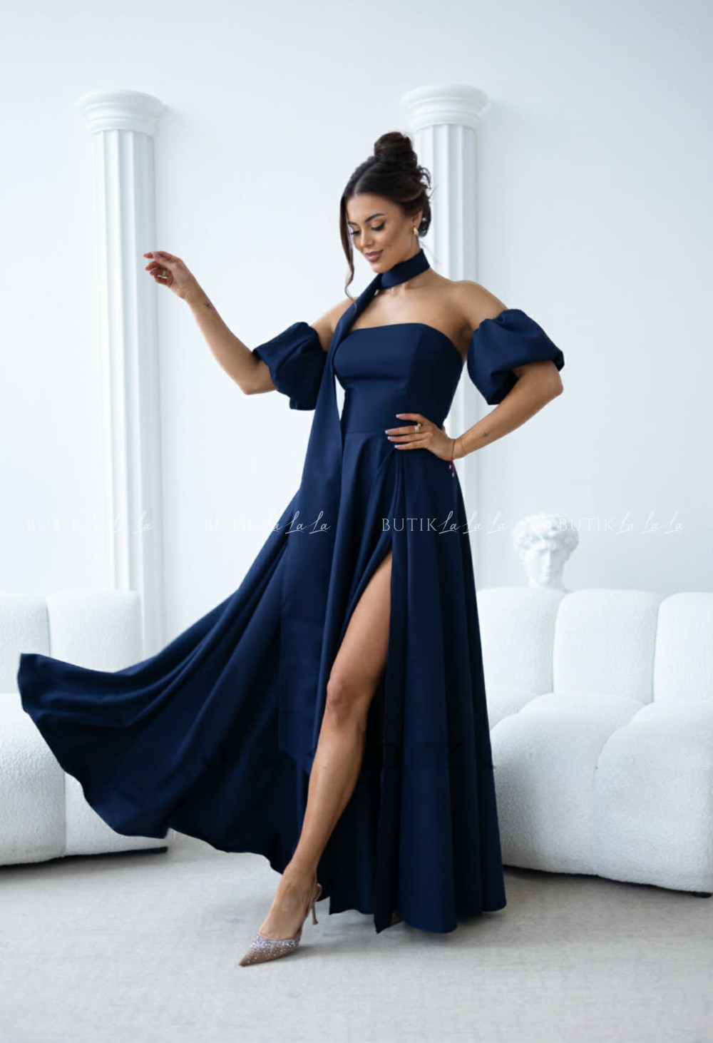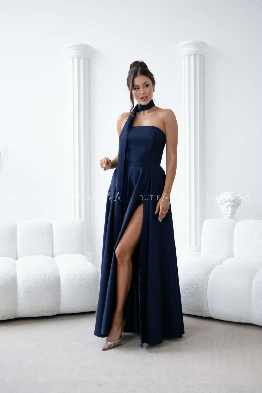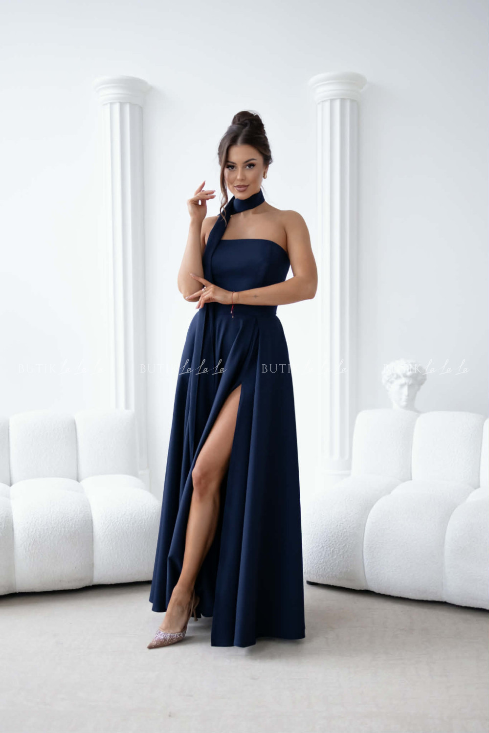Sukienka maxi granatowa z szarfą i rękawkami Forest