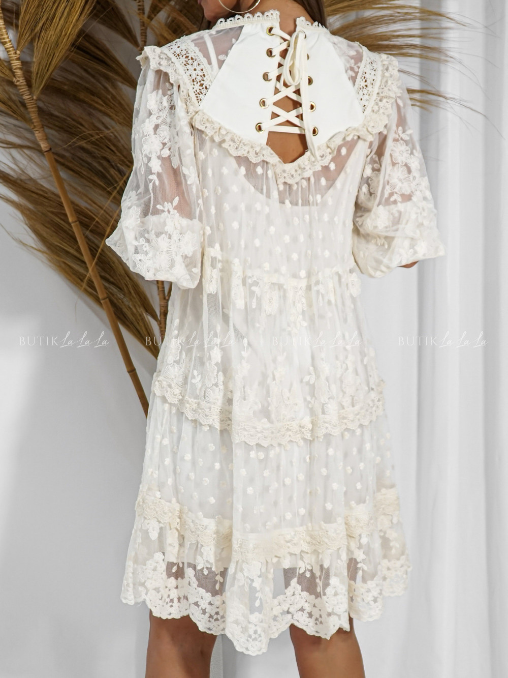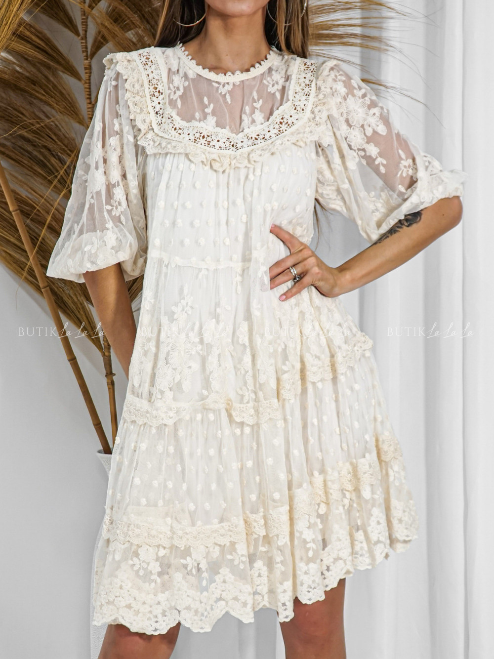 Elegancka sukienka przed kolano w jasnym kolorze wykonana z wysokiej jakości materiału. Sukienka z koronki zdobiona kropkami, dzięki nim wyróżnia się i nadaję dziewczęcego uroku . Model sukienki w kształcie litery ,,A''. Posiada bufiaste rękawy zakończone gumką. Dekolt pod szyję i luźniejszy krój sprawia że sukienka sprawdzi się na wszelkiego rodzaju okazję jak i na co dzień. Wiązana z tyłu. Sprzedawana w zestawie z luźną halką. Idealna na przeróżne okazje. Musisz ją mieć w swojej szafie.