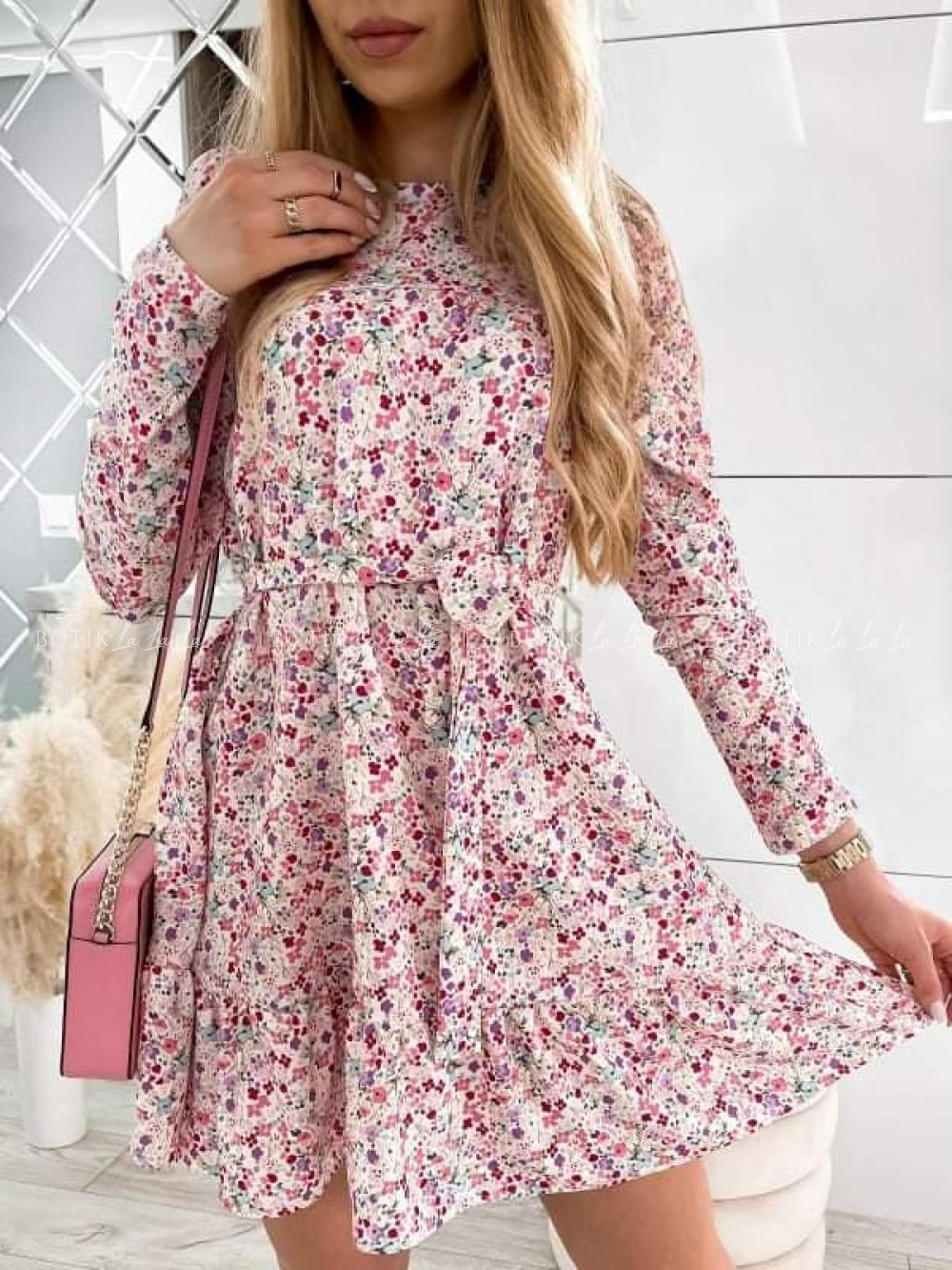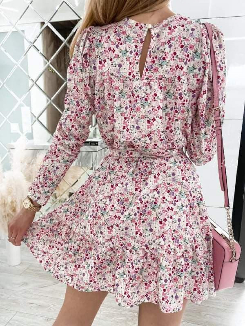 Śliczna sukienka zdecydowanie podbije serce niejednej z Was. Wykonana została z tkaniny w piękny, kwiatowy print. Zabudowany dekolt w łódkę, bufka na ramieniu, długi rękaw, zapięcie typu łezka zakończone guzikiem. Będziesz czuć się dziewczęco, swobodnie i wygodnie. Fason nie krępuje ruchów, jest szersza dzięki czemu zamaskuje mankamenty figury. W zestawie posiada pasek który pozwala na podkreślenie talii. Sukienka o luźnym kroju to doskonały wybór do codziennych stylizacji. Ciesz się zjawiskowym wyglądem cały czas!