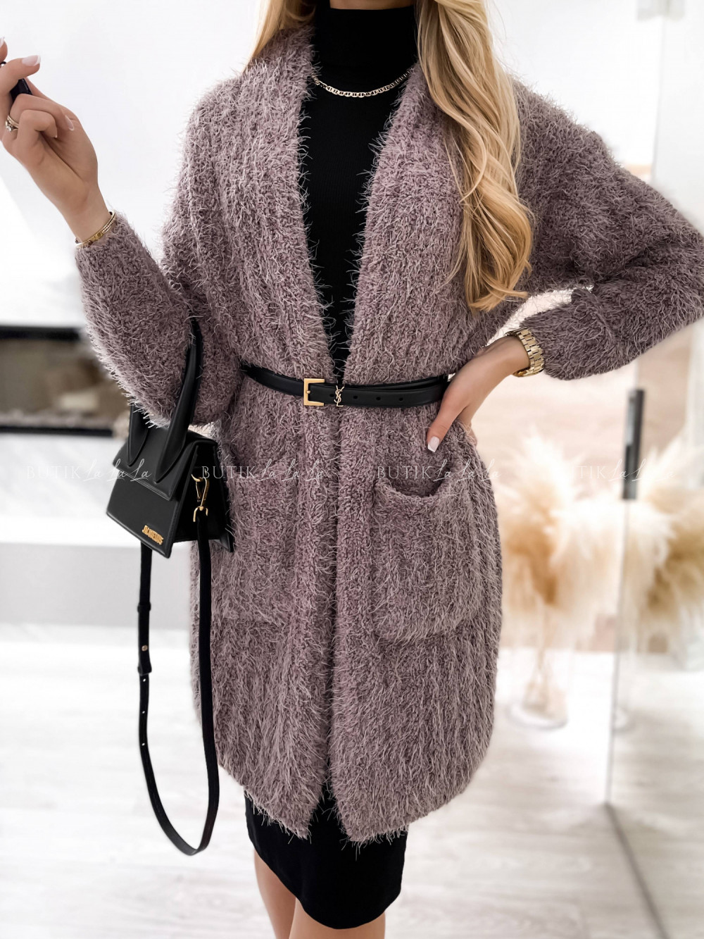 Prosty, o nieco dłuższym kroju kardigan, wykonany z przyjemnego w dotyku materiału. Bardzo ciepły, idealnie sprawdzi się na chłodniejsze dni. Stworzysz z nim ciekawe stylizacje. Kardigan posiada dwie kieszenie.