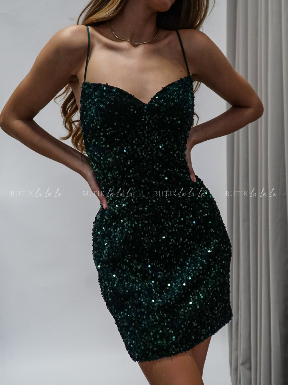 Sukienka cekinowa butelkowa zieleń z wiązaniem Peritto