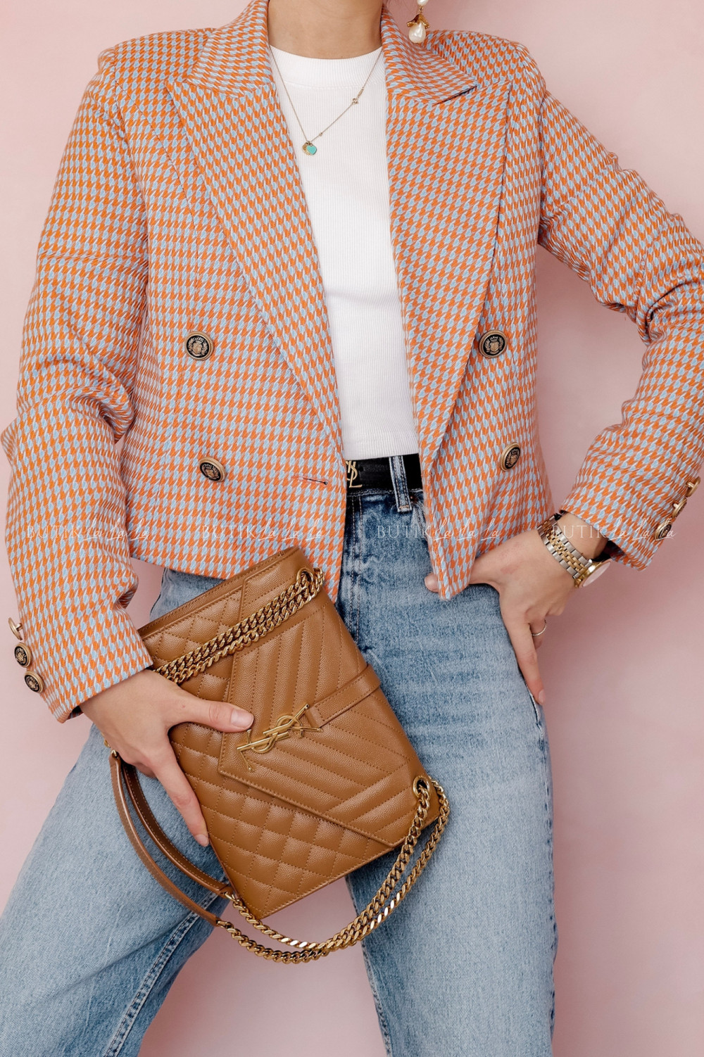 Modelka ma 170 cm wzrostu, prezentuje rozmiar XS