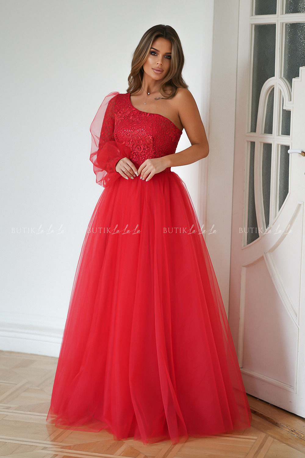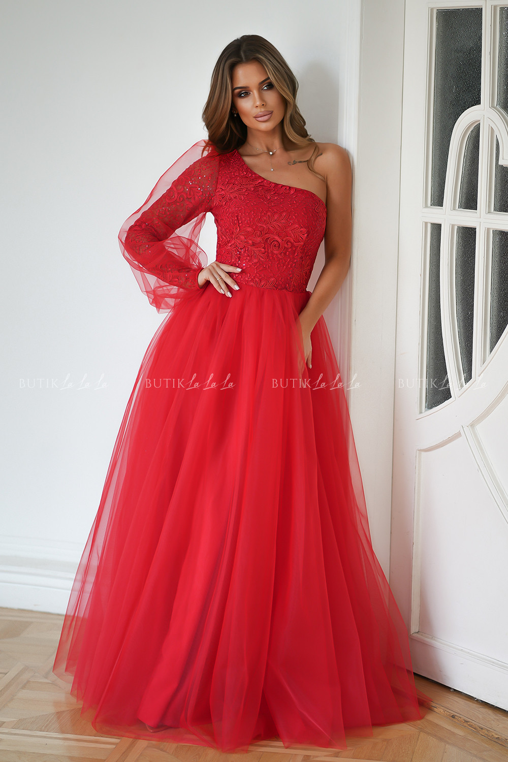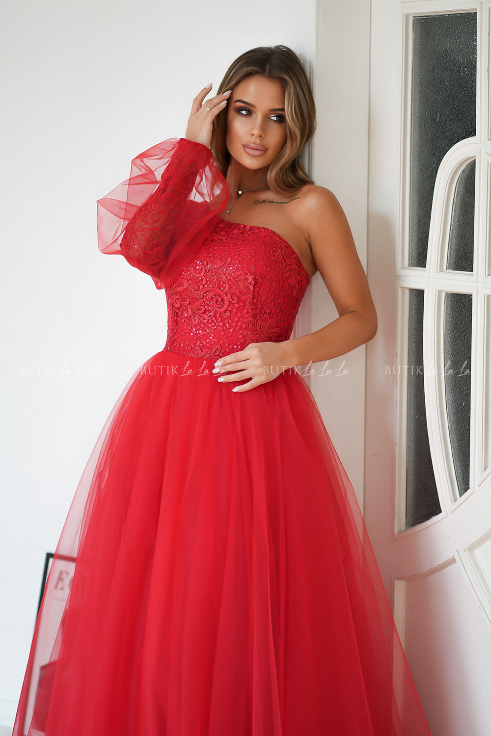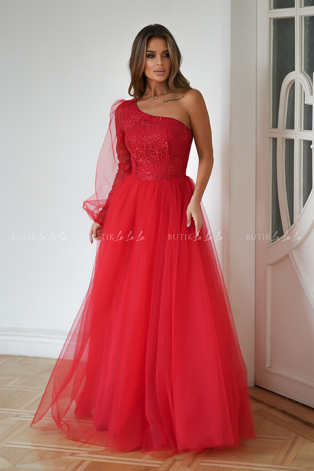 Zjawiskowa sukienka balowa z rękawem na jedno ramię. Góra pokryta śliczną, mieniącą się koronką, dodatkowo na rękawie przyozdobiona minimalistyczna siateczką. Dół rozkloszowany uszyty warstwowo ze sztywniejszej siatki, co dodaje objętości. Dostępna w prześlicznych kolorach.