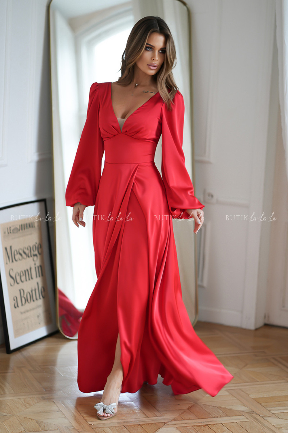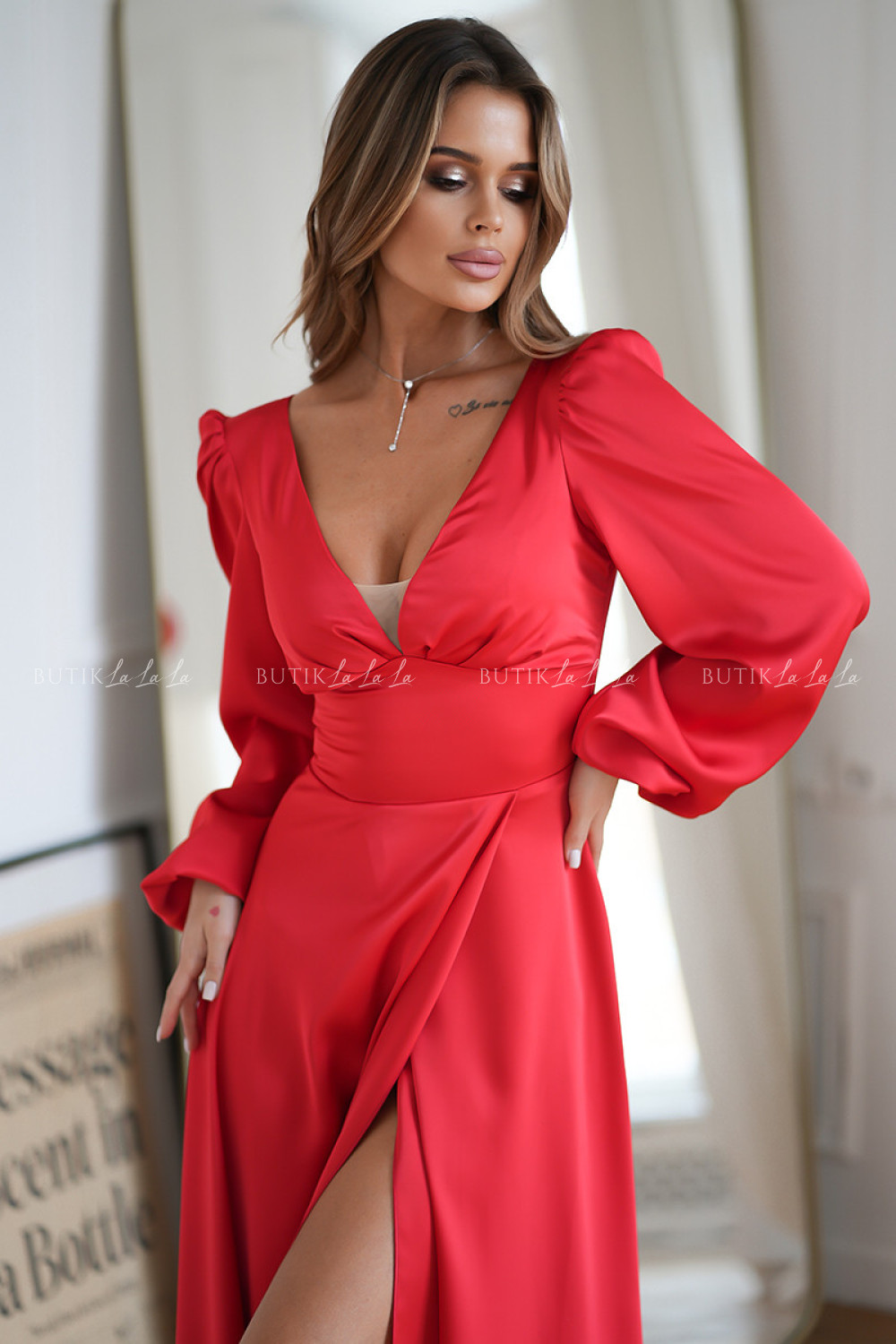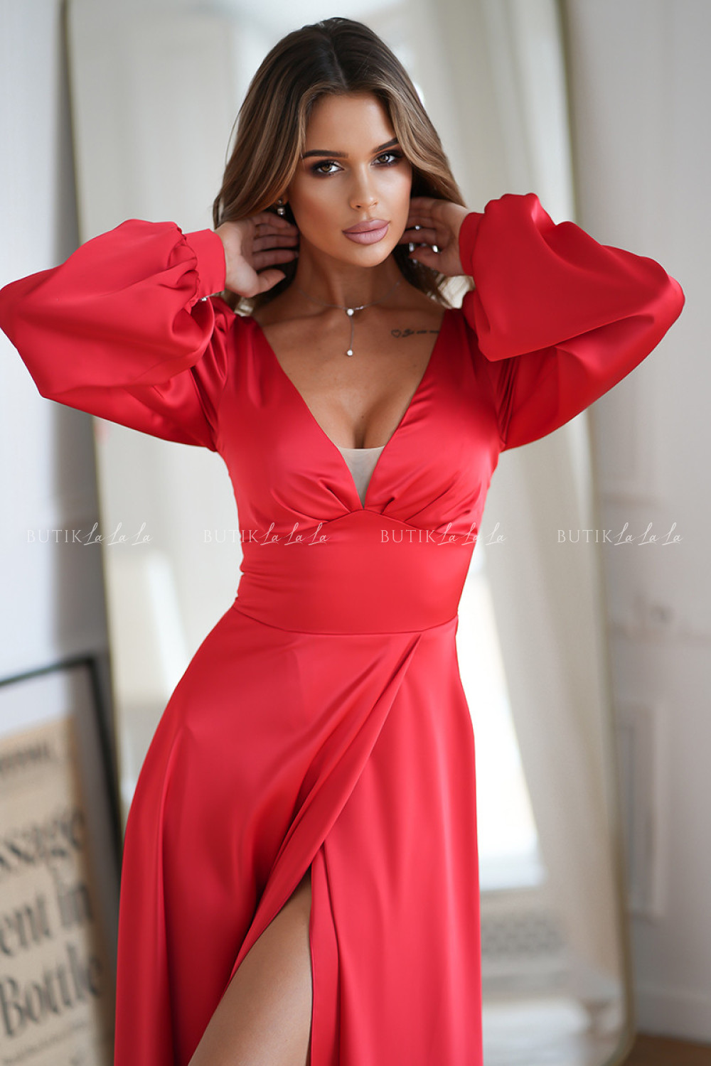 sukienka satynowa czerwona na długi rękaw Michael