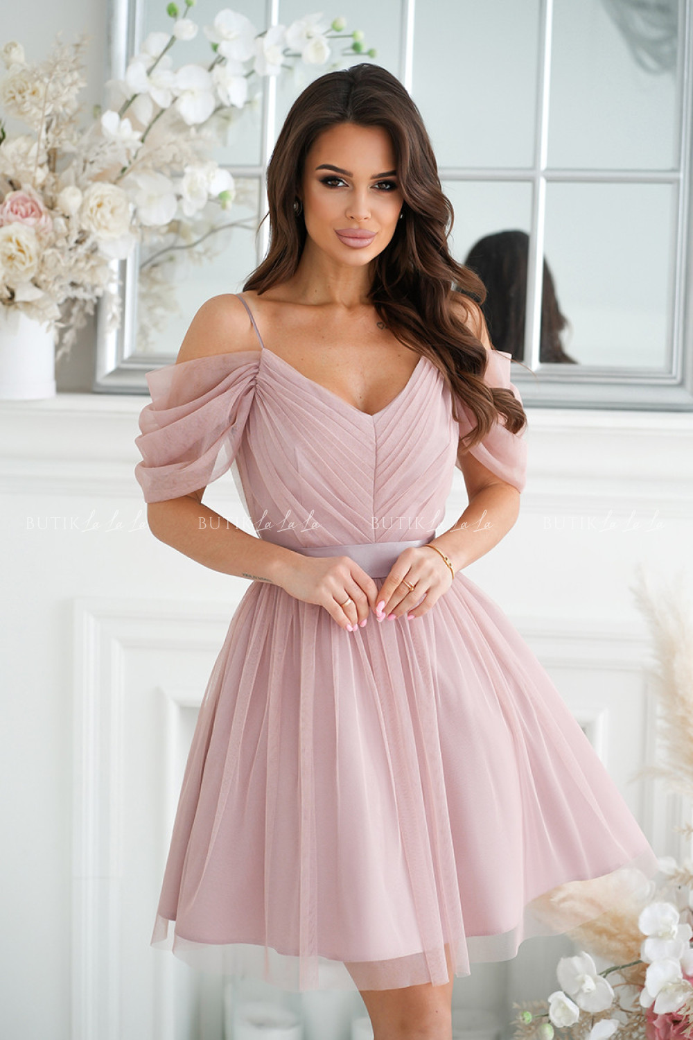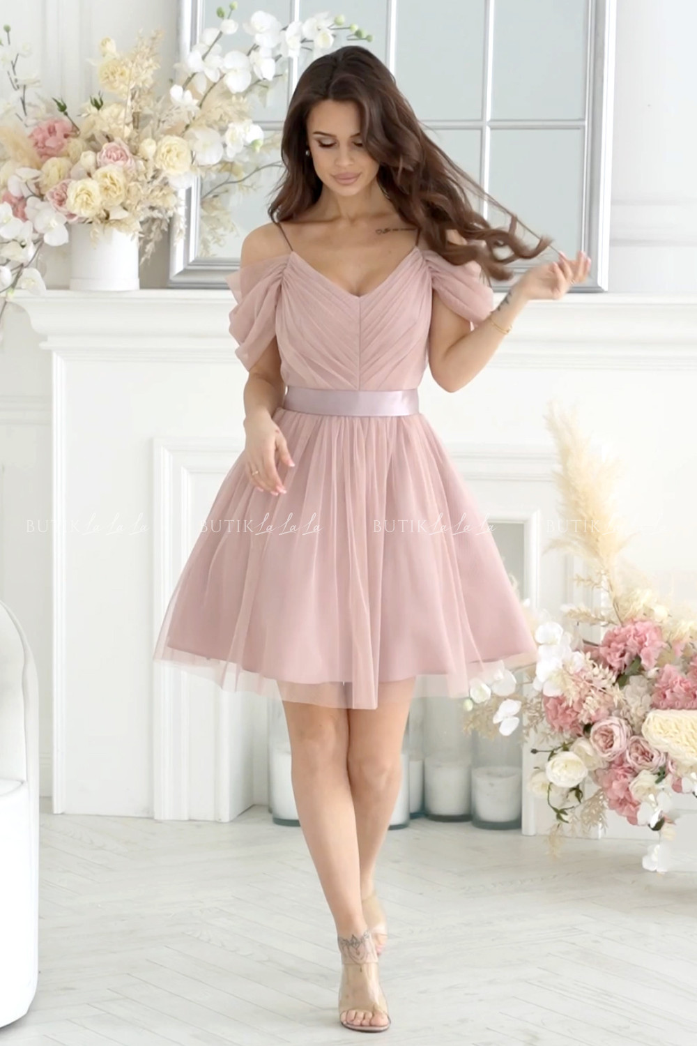 Sukienka tiulowa z paskiem beżowo pudrowa Esmara