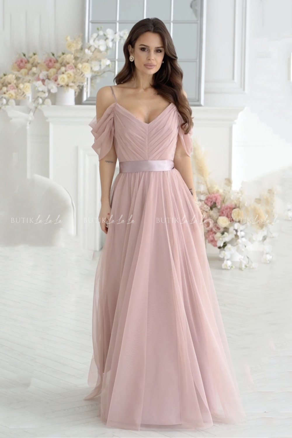 Sukienka maxi tiulowa pudrowo beżowa Leokadia