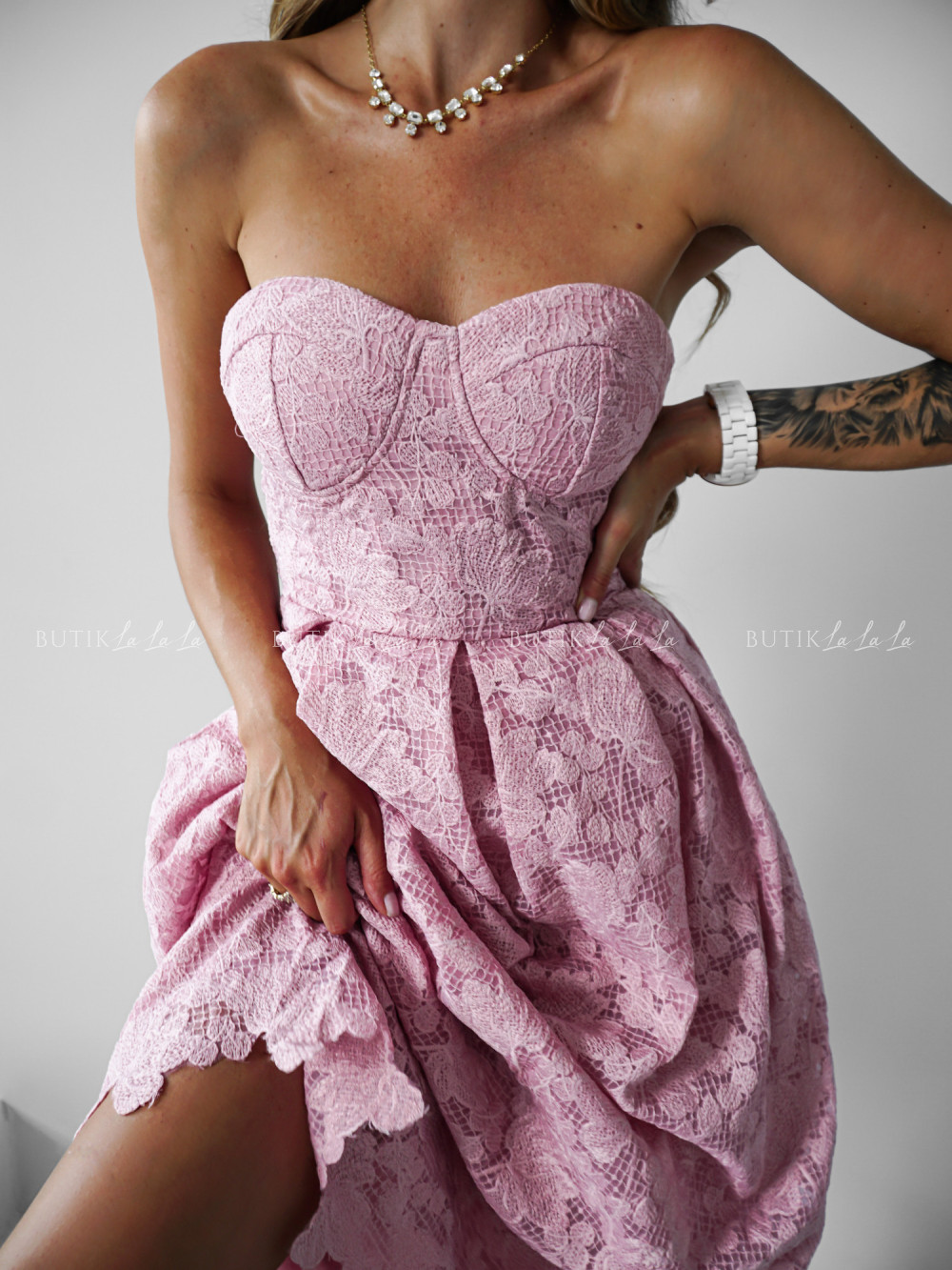 Sukienka posiada gorsetowe wiązanie, dzięki czemu można regulować szerokość w biuście oraz talii.